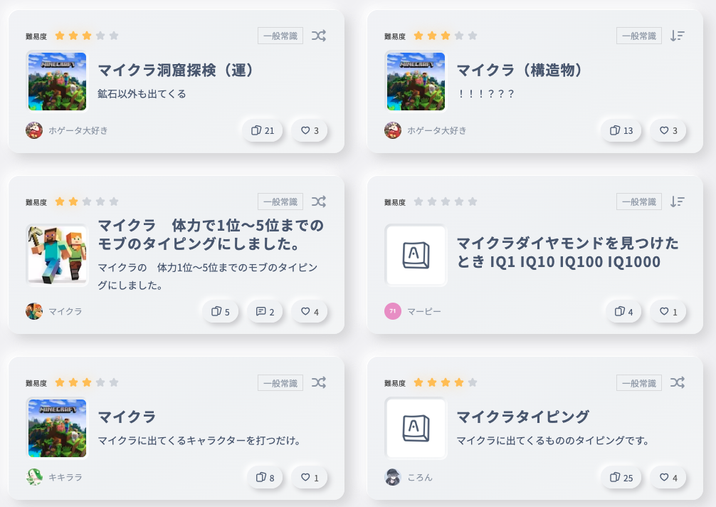 「マイクラ」で検索してみたら、マイクラ関連のタイピングも多数。